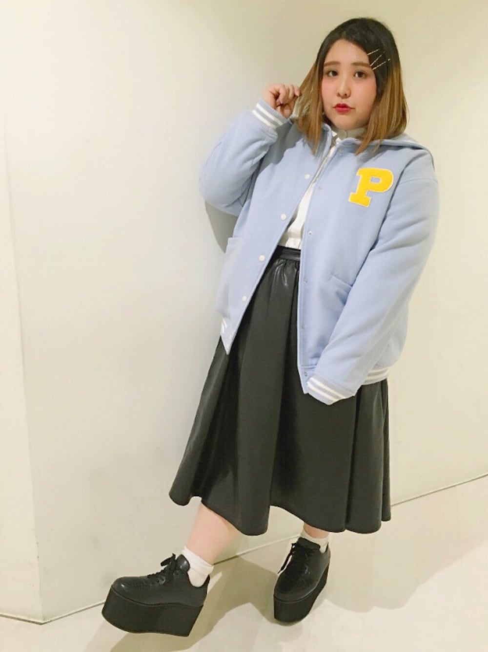 フェイクレザーのスカートに パステルカラーのセーラースタジャンを合わせて、甘✖️辛コーデ!!♪ カジュアルダウンしすぎないように インには白シャツを◎