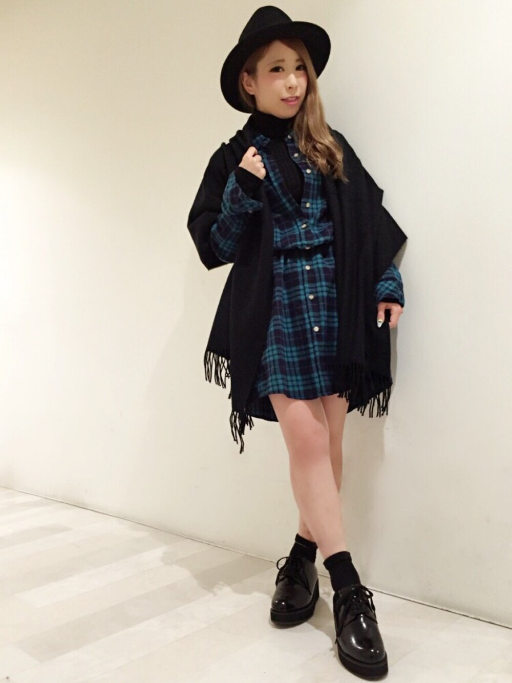 チェックのシャツワンピの中には ハイネックを覗かせて◎ ハット、ストール、ベルトなど 黒小物もふんだんに使った オトナコーデ♪