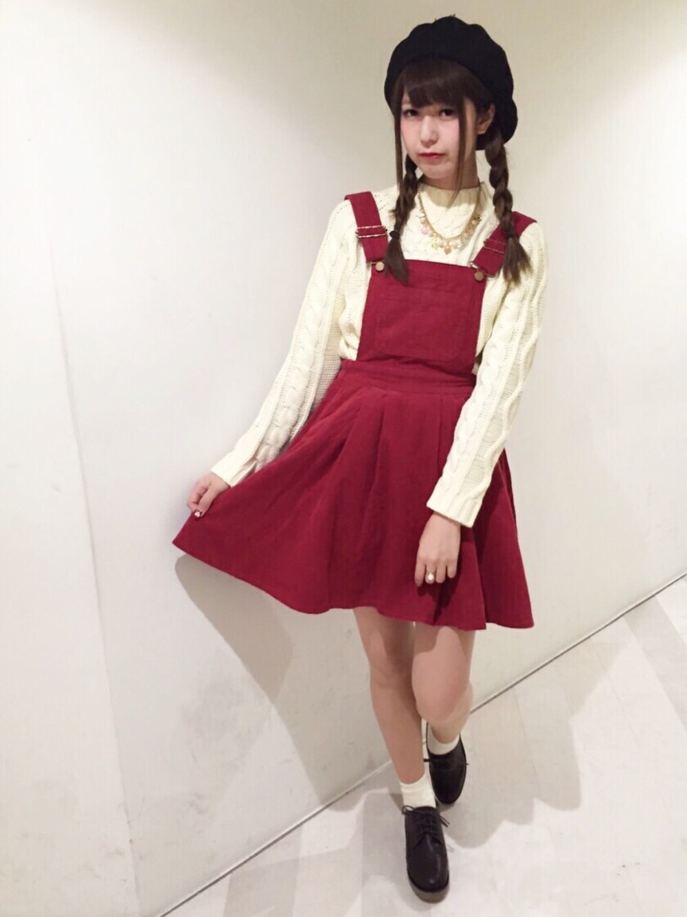 ジャンスカを使ったガーリーコーデ♪ アイボリー×ワインレッドで少しクリスマスを意識☆☆ バルキーケーブルニットの首元にはチャームネックレス‼︎このネックレスは7個のオリジナルチャームが付いていてプレゼントにもオススメです♪