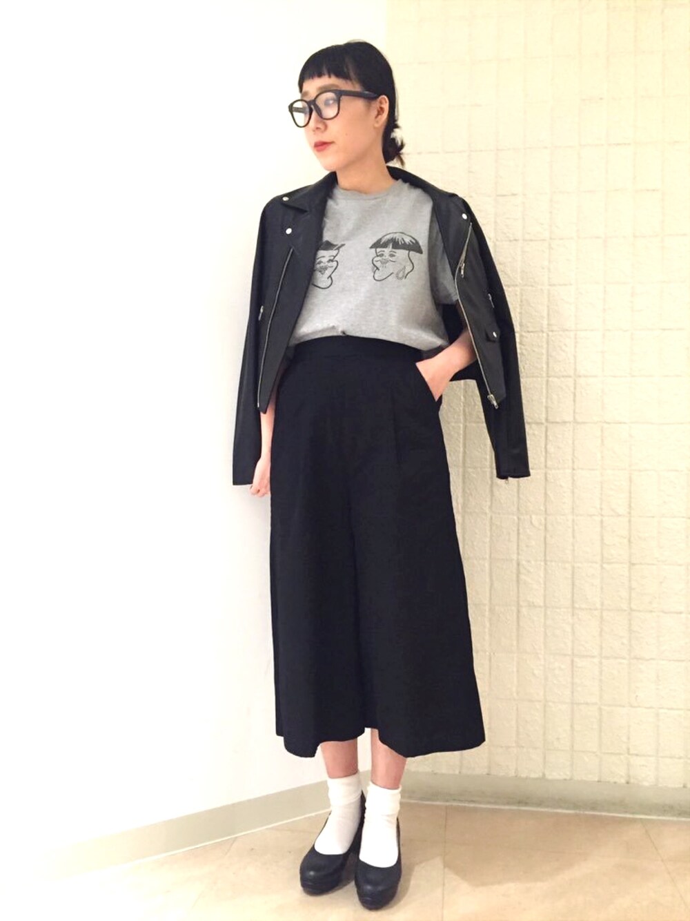 Tシャツスタイルもライダース&パンプスでスタイリッシュに♪♪ 個性的なFUGUフェイスTシャツはコーデのスパイスになります♡