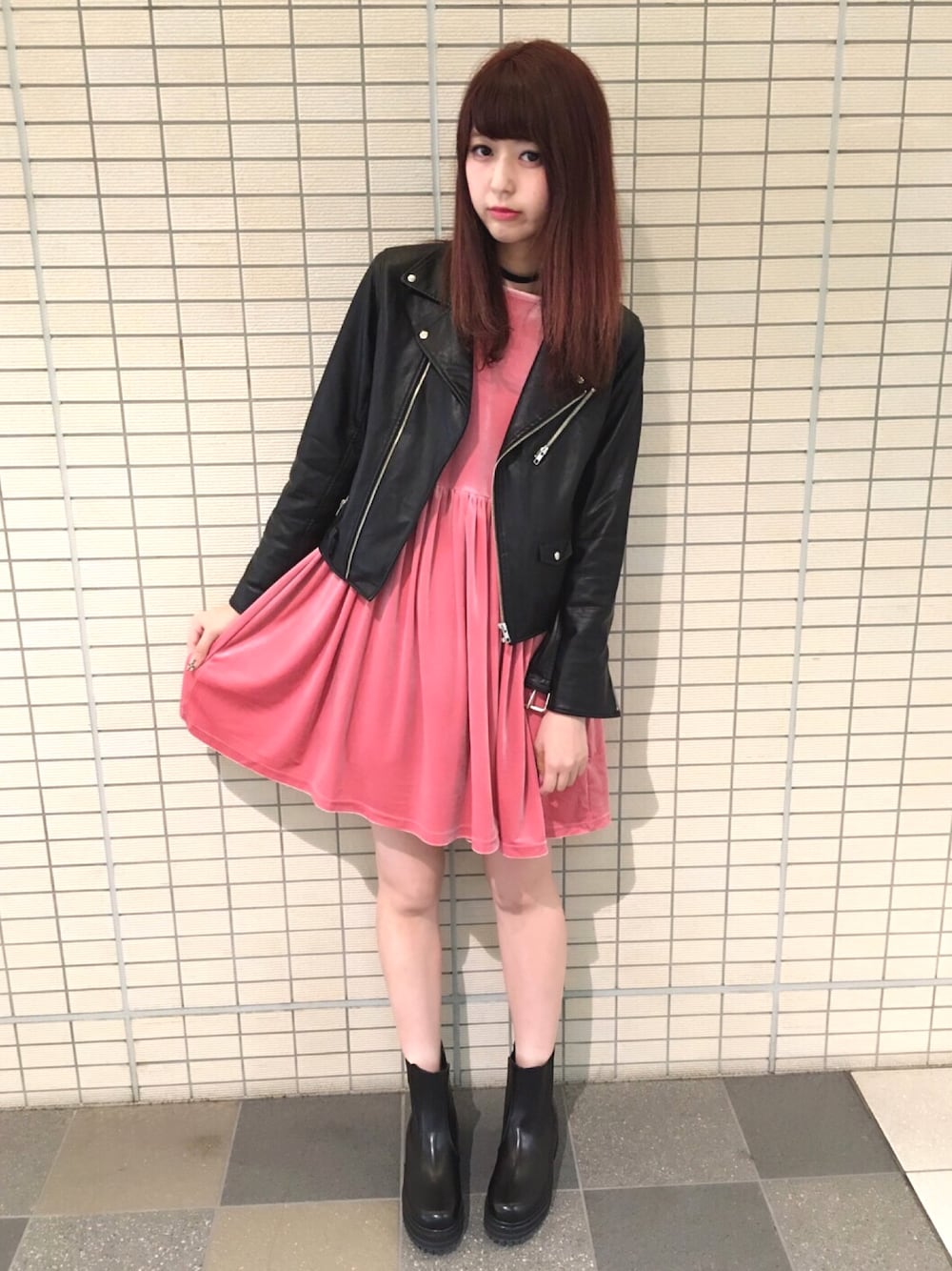 ワンピ×ライダースジャケットの甘辛スタイル♡ 小物とアウターをブラックで揃えるとコーデがまとまります♬