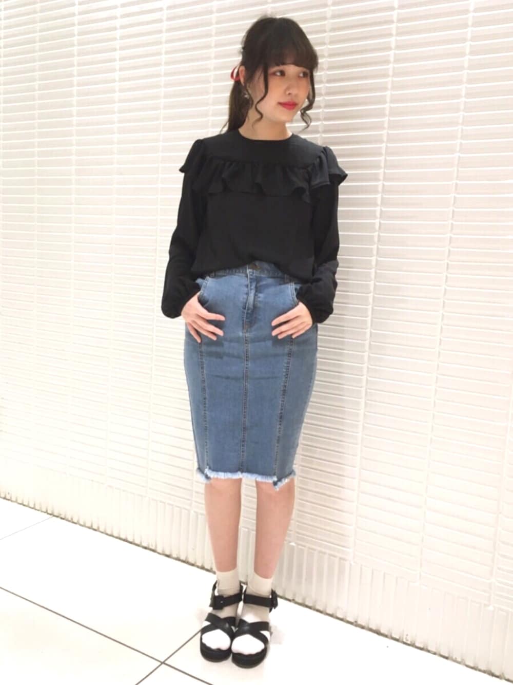 胸元の揺れるフリルがポイント🎵 キレイにまとめた オトナカジュアルスタイル◎