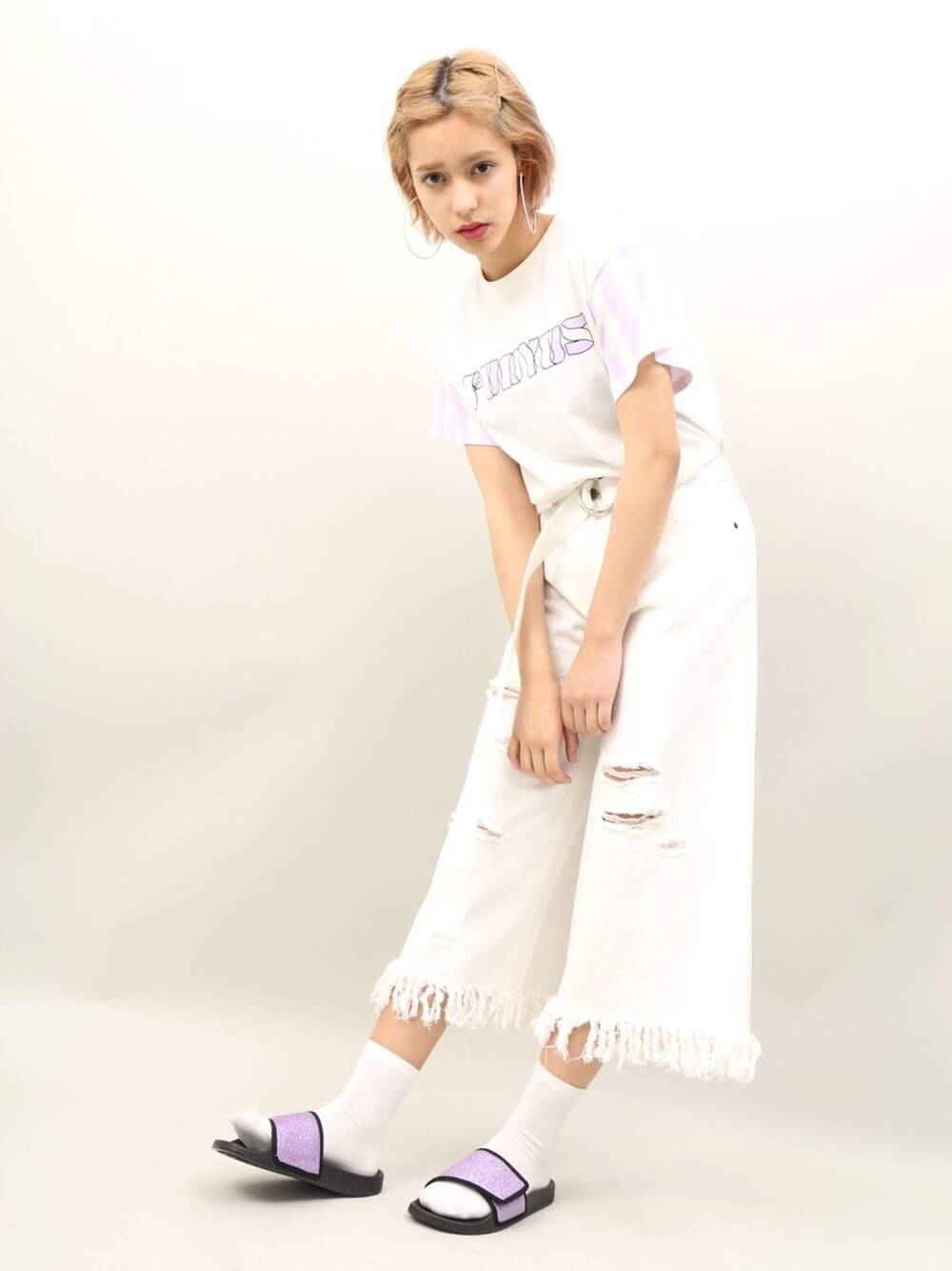 夏らしいホワイトコーデに パープルを差し色に♡! クラッシュパンツは 裾のフリンジとクラッシュが トレンド感満載◎!