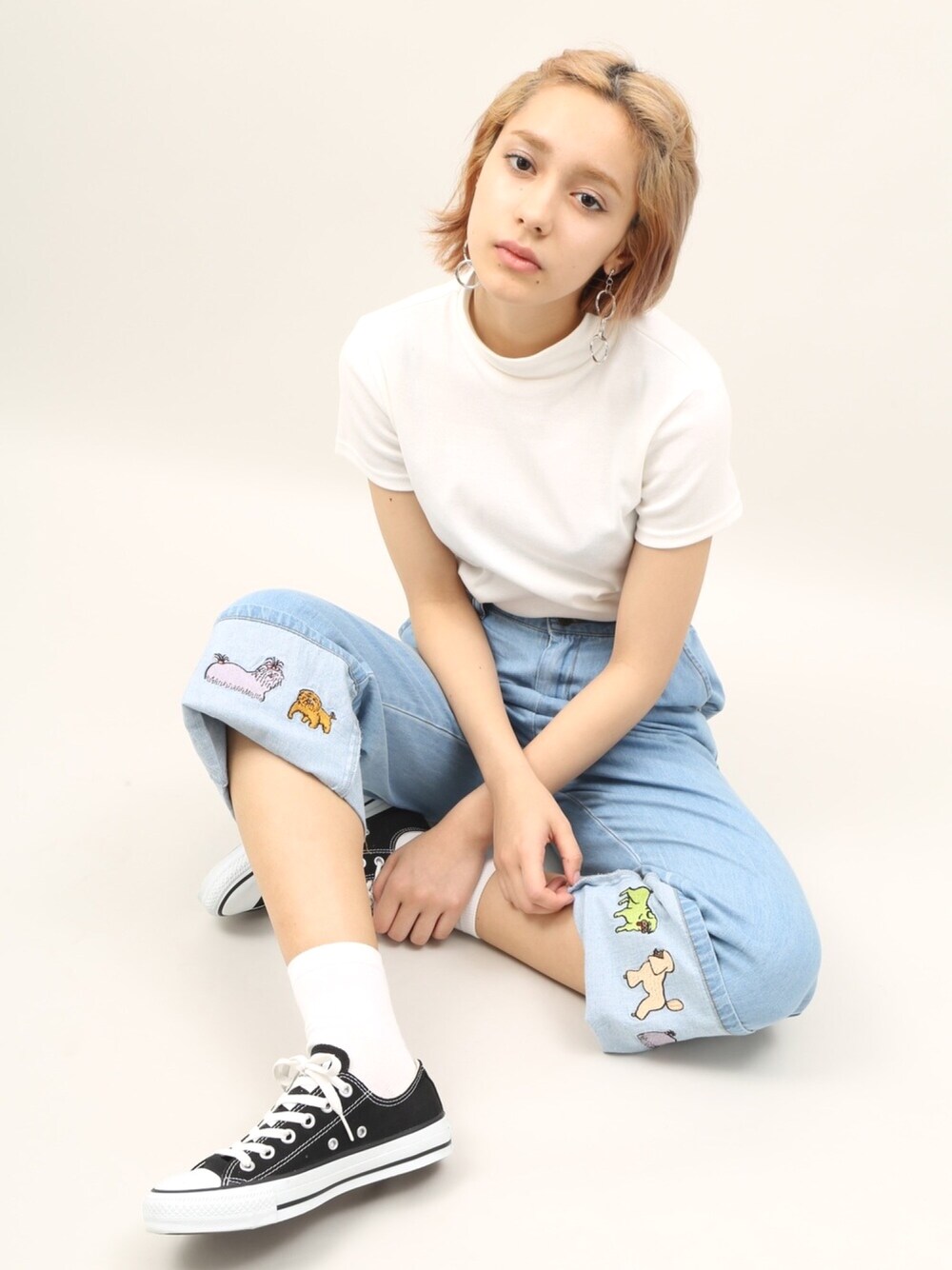 🐶ドッグの刺繍🐶が可愛すぎる 折り返しデニムパンツ♡ 目立たせるためにトップスはシンプルに◎