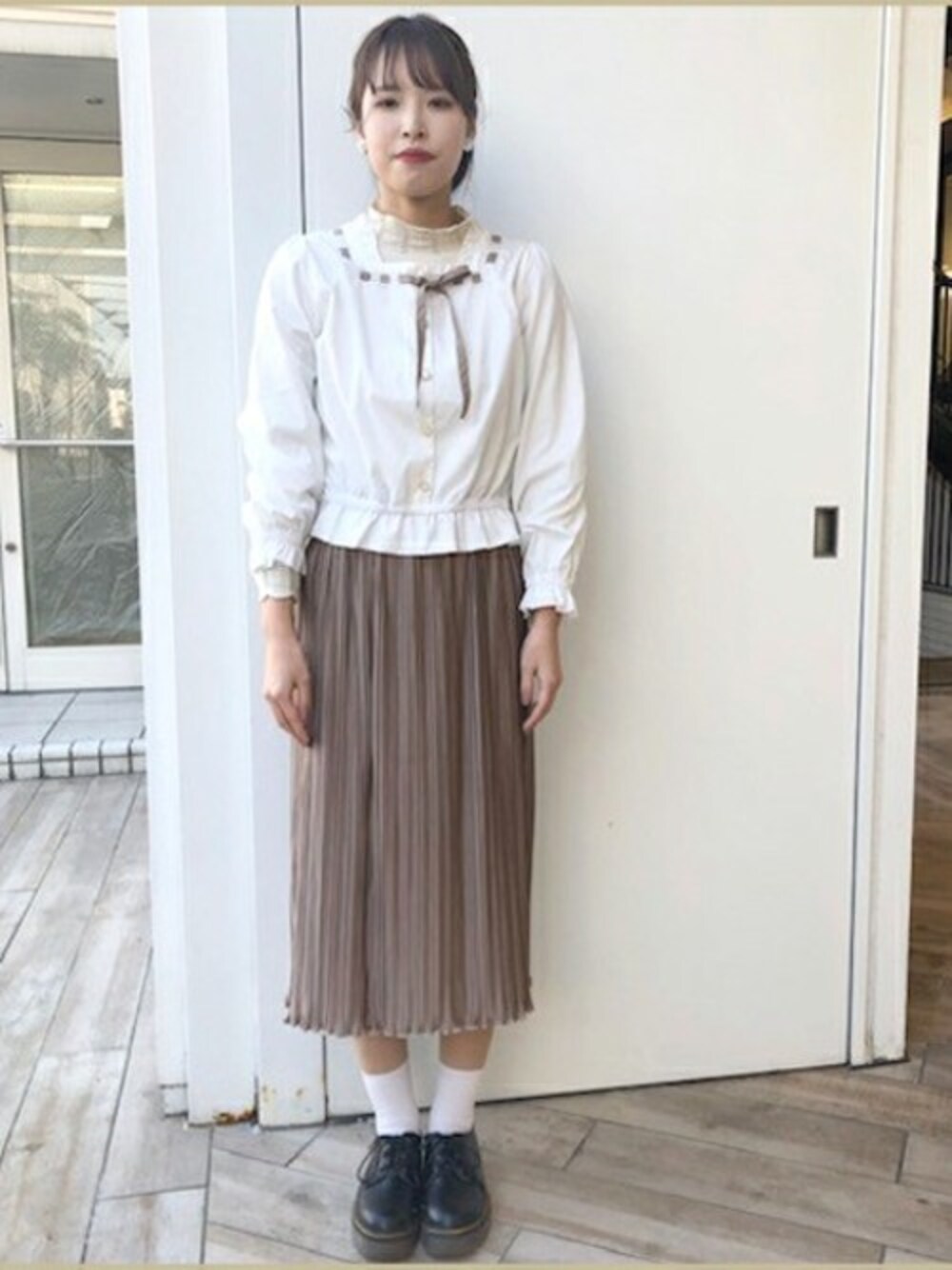 肌寒い日はブラウスに インナーを合わせてチラ見せ!! 色味を合わせて、光沢感のあるスカートで 生地感をアクセントに♪