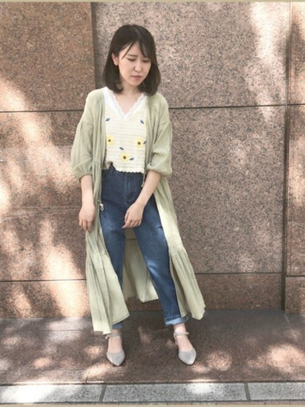 透かし編みの涼し気なコットンニットトップス♪ 可愛い向日葵の刺繍には シンプルなデニムと羽織を合わせて ナチュラルなコーデに♡