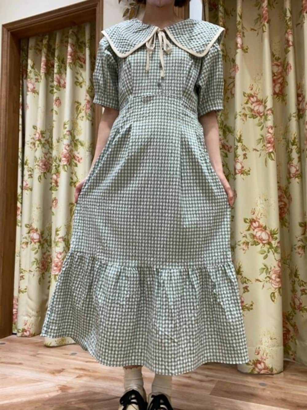 軽い生地なので暑い夏にぴったりなワンピースです。ギンガムチェックと色合いがレトロな1枚です。