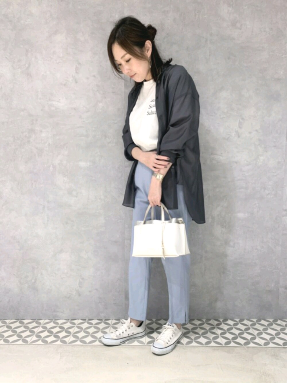 ご覧いただきありがとうございます* こちらのシアーシャツはスタッフ人気も高く、 おすすめのアイテムです♡ パンツは淡いブルーを合わせて 大人カジュアルなスタイリングに◎