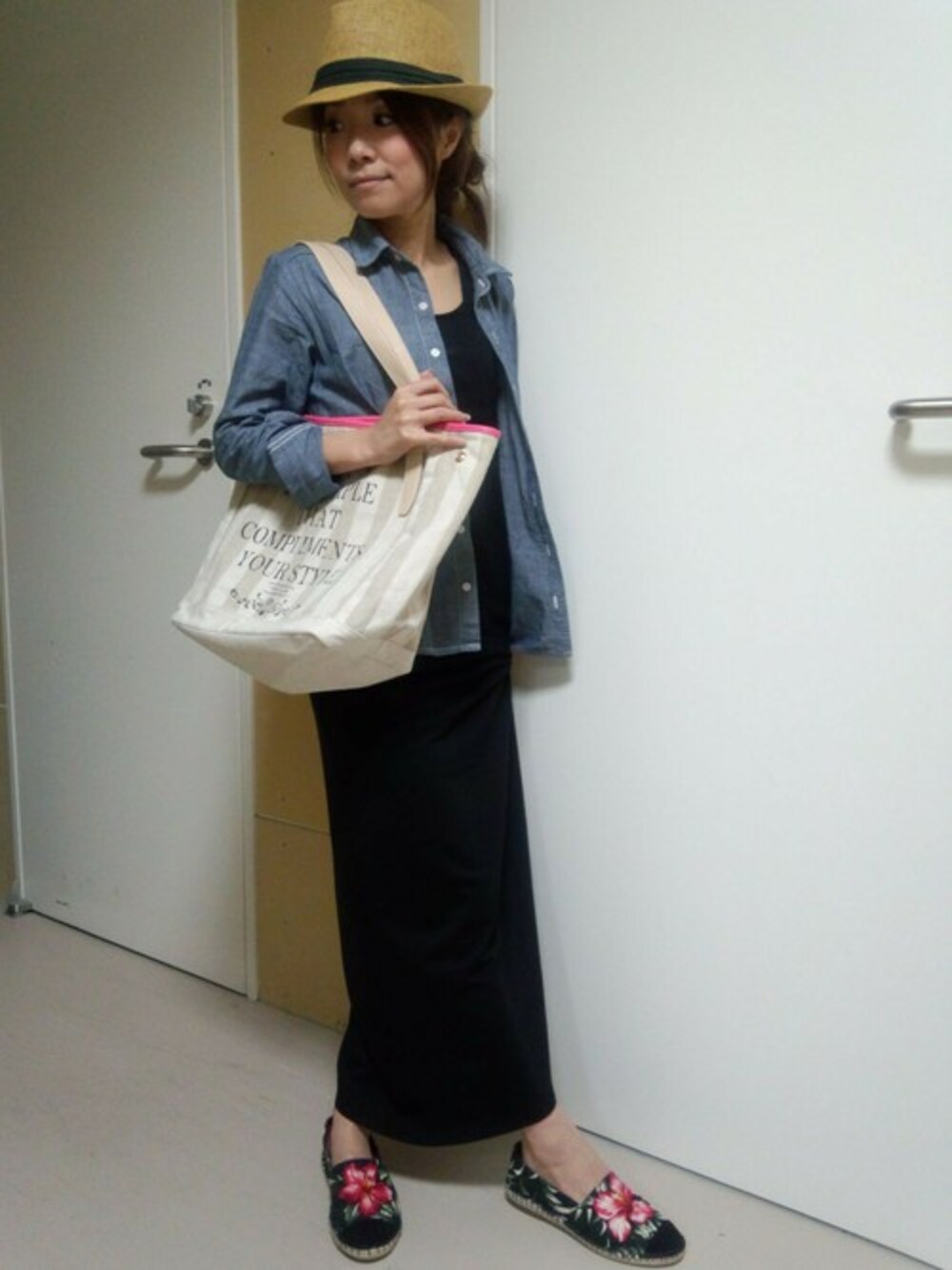 ジュートスリッポンでリゾート気分を満喫☆ スリッポンとマキシワンピ―スを同色で合わせ 花柄をワンポイントにコーディネートしてみました!