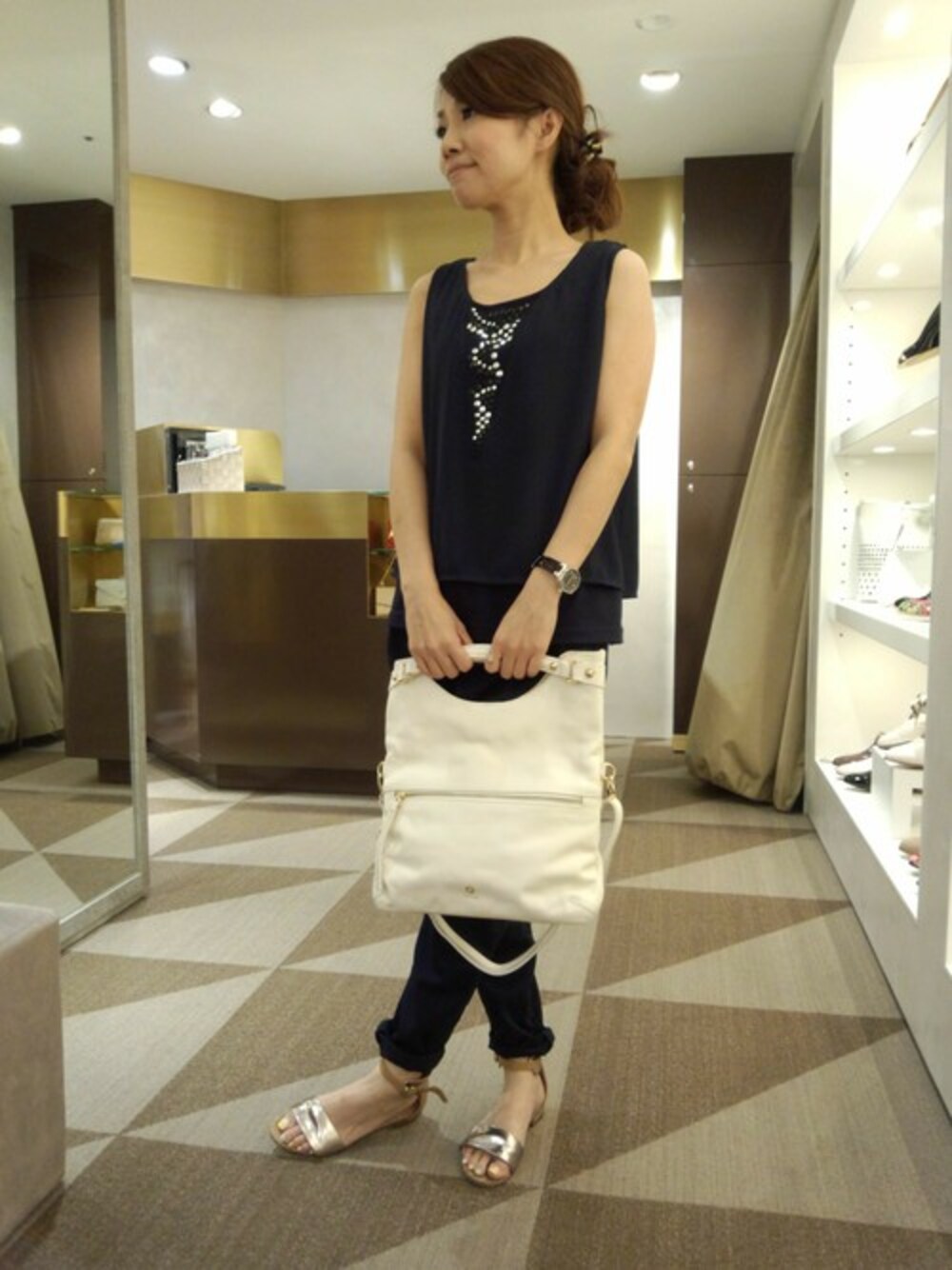 ホワイトカラーをアクセントにセットアップコーデで今年らしくまとめてみました! バッグはデザイン性だけでなく利便性があり、折り返しやショルダーなど何通りもの持ち方が出来るマルチショルダーです。