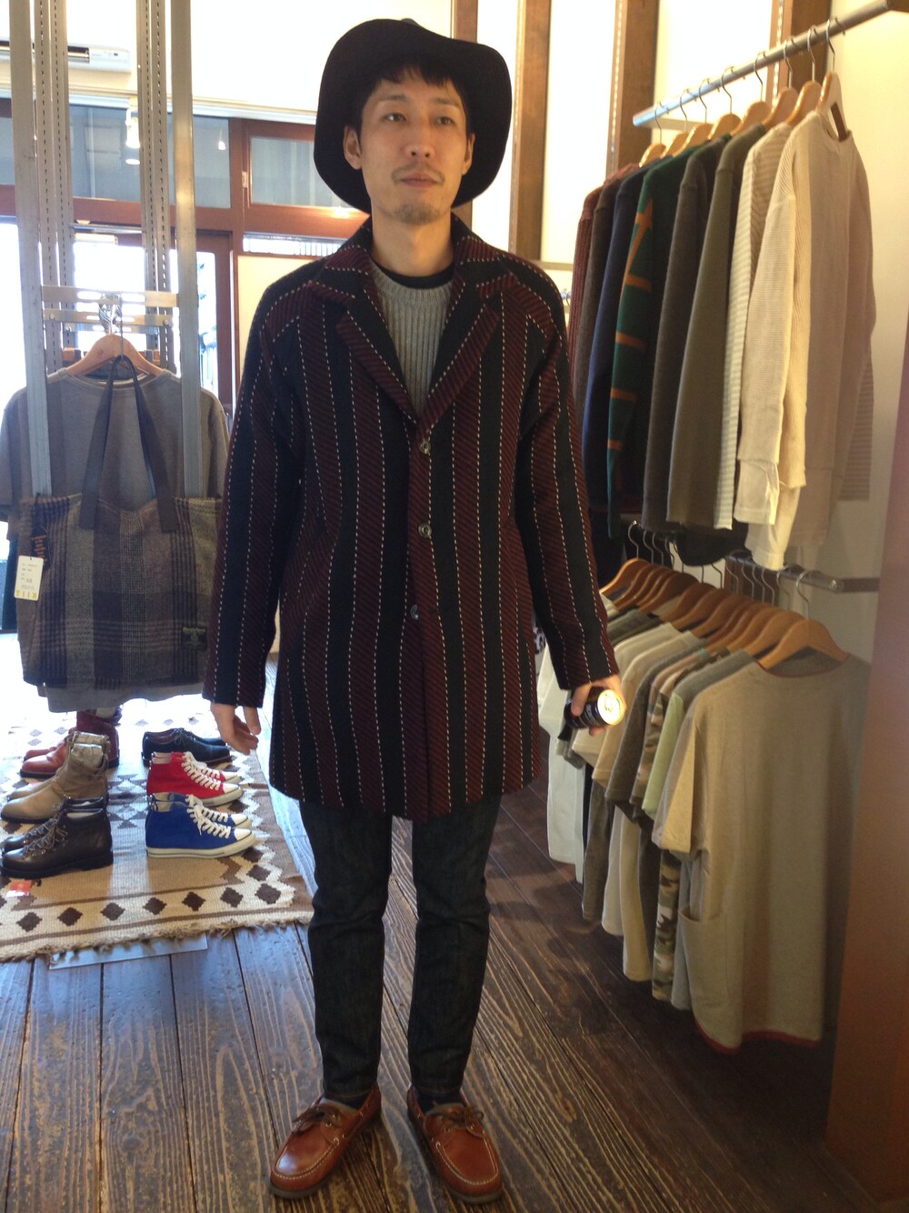 GUEST SNAP★ COAT/.efiLevol KNIT/DISCOVERED PANTS/Kapital HAT/NEEDLES SHOES/LISS SOX/MR.EVERYDAY'S シンプルな装いながら、大柄のコートやハットで、少し人と違ったチェスターコートスタイルに。 いつも着こなしがうまいM君、ほんとに色々な着こなしをするので、ご来店が楽しみな1人です。