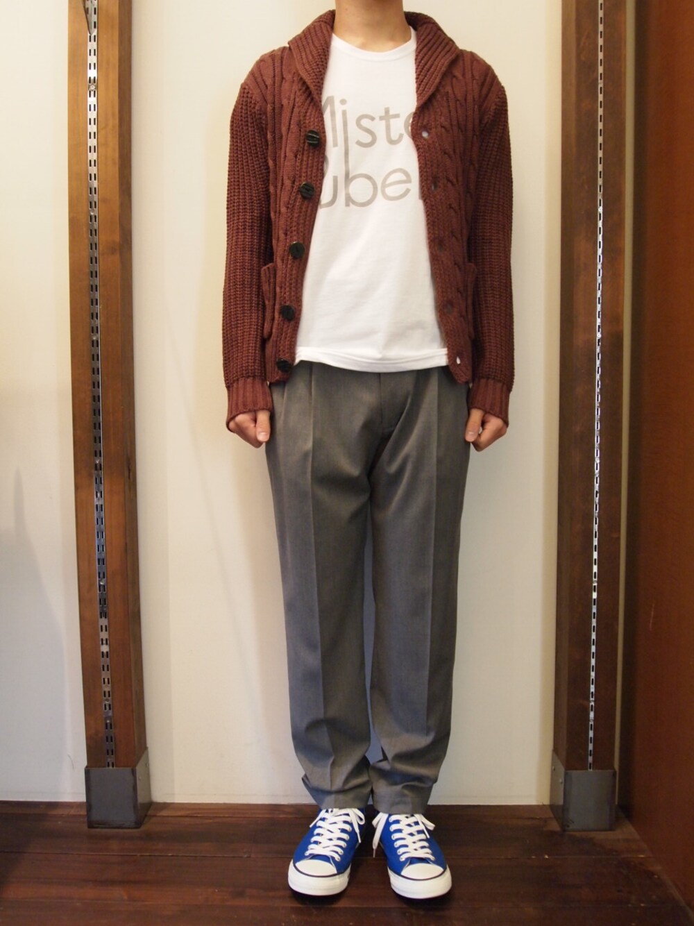 FINAL SALEのアイテムと、コーディネートしてみました。 LISS CABLE KNIT CARDIGAN(WINE) 10.290yen→6.688yen DISCOVERED LOGO TEE(MONOTONE/GRAY) 5.250yen DISCOVERED TAPERED PANTS(GRAY) 22.890yen DISCOVERED LIVE STAR SNEAKER(BLUE) 14.700yen→10.290yen 今時期は、この感じで+アウターを羽織っても。 黒抜きのスタイリングは、やっぱ軽快になるので、それだけでも春を意識できると思います。 ラフに履いたスラックススタイルです。