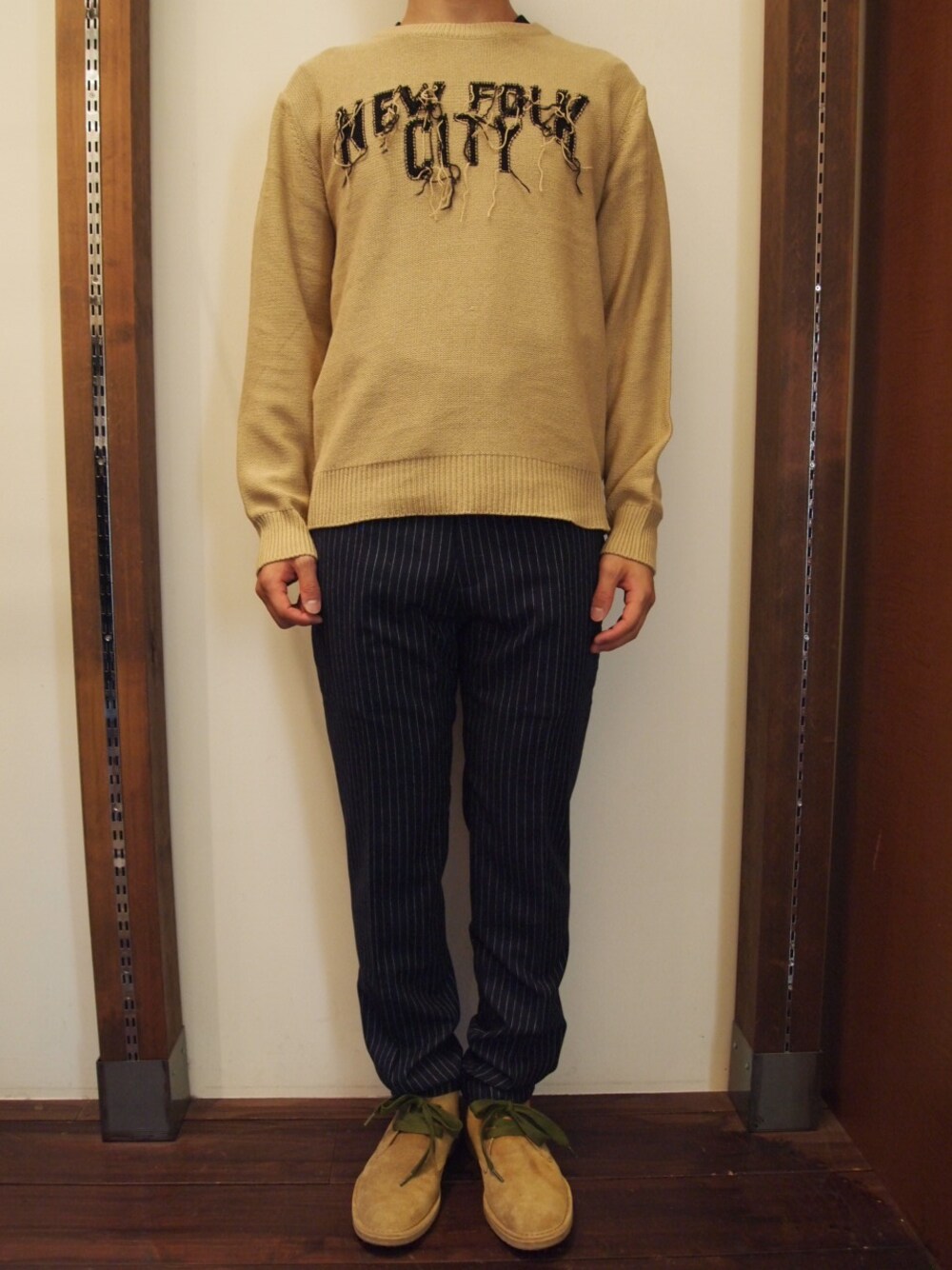 コットン/アクリルのニットは、すぐに着られるライトな1枚。 シンプルにストライプ柄のスラックスで合わせて、 少し大人っぽくしました。 コート系は濃いカラーがどうしても多くなりがちなので、 インナーに柔らかいカラーもとても使えると思います。