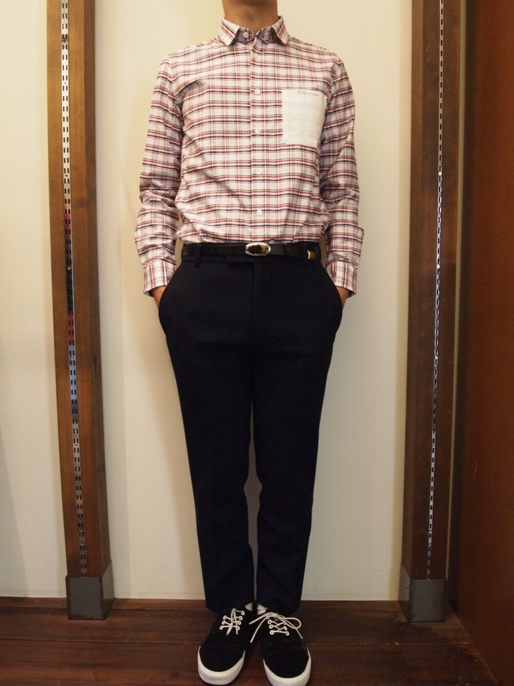 ふっくらしたウールのアンクルパンツを、シャツINでかっちりと着ました。 アウターは、チェスターやステンカラーのコートでも、 MA-1やスタジャンでスポーツミックスでもどちらも振れるよう、 シンプルでBASICなシャツスタイルです。 まだアウターの要らない日には、 ニットやスウェットのプルオーブで チェックの柄の量を調節してみるのもオススメです。