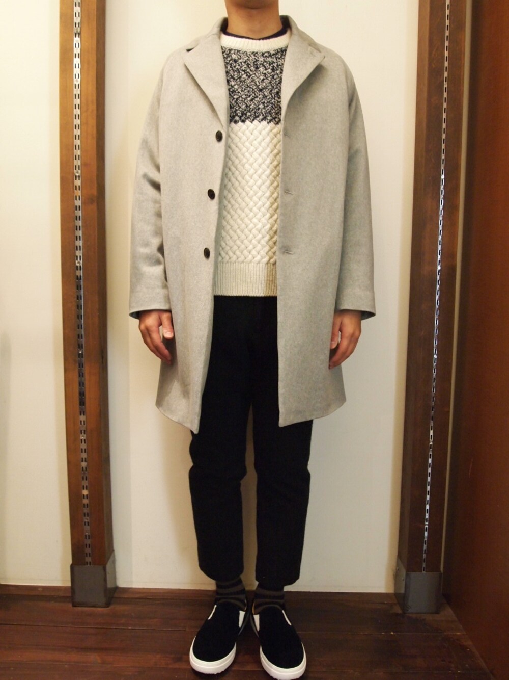 ライトなカラーの度詰めコットンのコートには、 バイカラーのざっくりニット、ウールパンツで ほっこりとした素材感を使ったコーディネートを。 シューズのコーデュロイも加えて、 様々な素材感を楽しんでいただけるスタイリングです。 肩の落ちた、ドロップショルダーのコートは、 ざっくりニットを入れても窮屈感ゼロで着られ、 持っておいて春先にも使える度詰めコットンなのも、 不意に汗をかかない嬉しい仕様でサッパリと着られます。 優しい素材感とシルエットを意識したコーディネートです。