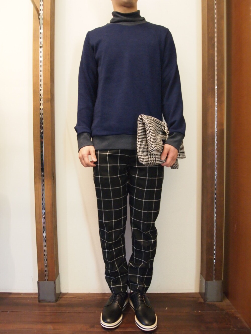 上品なNAVY×GRAYのカラーリングで、 ライトなカラーのボトムスにも相性良く、また、ブルートーンのコーディネートにもオススメなニット。 ウインドウペンチェック柄のボトムスで、上品にまとめました。 Plenty別注のリバーシブルクラッチもグレンチェック、 柄×柄をシックにまとめたコーディネートです。