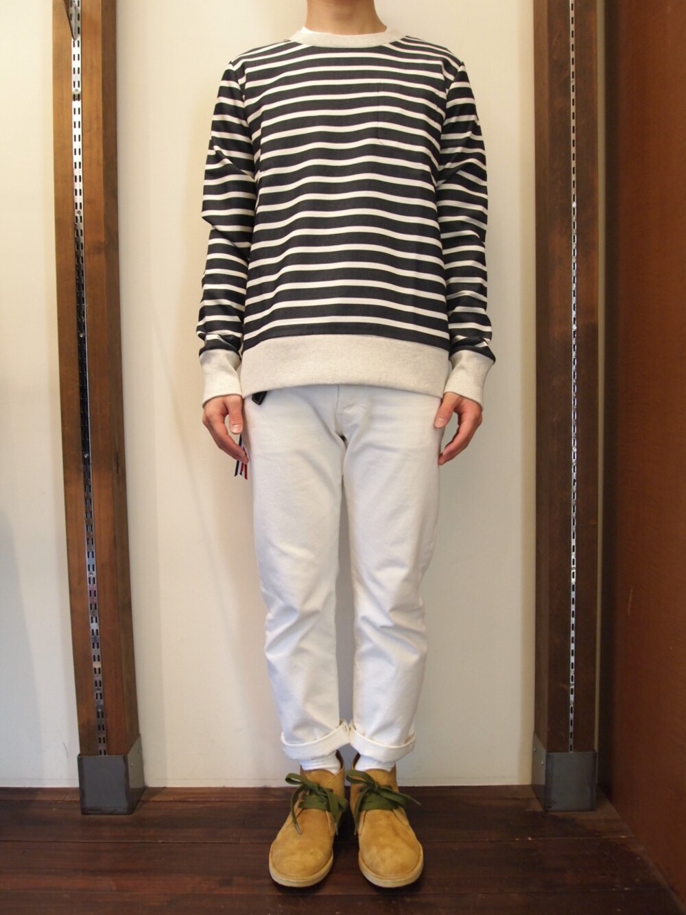 春らしく爽やかな白デニムに、 トップスは一ひねりあるスウェットで。 裏返した時も、オールホワイトの中にボタニカル柄のポケット、 ほんのり透けるボーダー柄で、やり過ぎないホワイトコーデで着ていただけると思います。 +でジャケットを着て、インナー使いをしてもとても映えるスウェットなので、 靴のトーンに合わせた、柔らかなカラーの羽織りがオススメです。