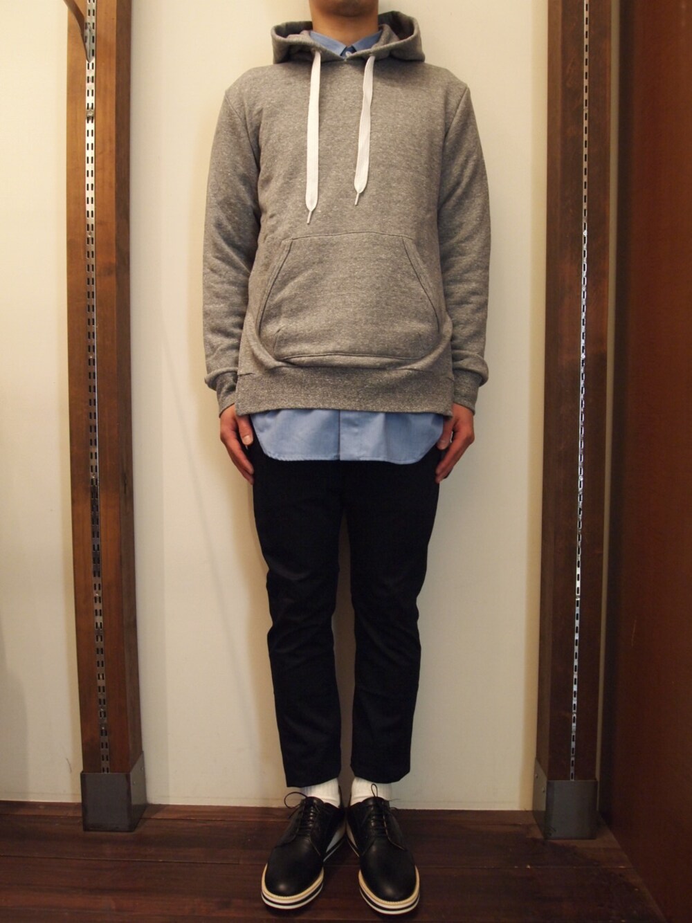 こんな雨の日は、サックスブルーのシャツを着たい! ですが、まだ少し1枚では寒いので、プルオーバーパーカーを上から着ました。 サイドの裾がZIPで開く仕様になっており、 レイヤードスタイルに最適な1枚です。 定番パンツもアンクル丈にして履いて SOX見せがやはりオススメです。 早く、春が来てほしいですね♪♪