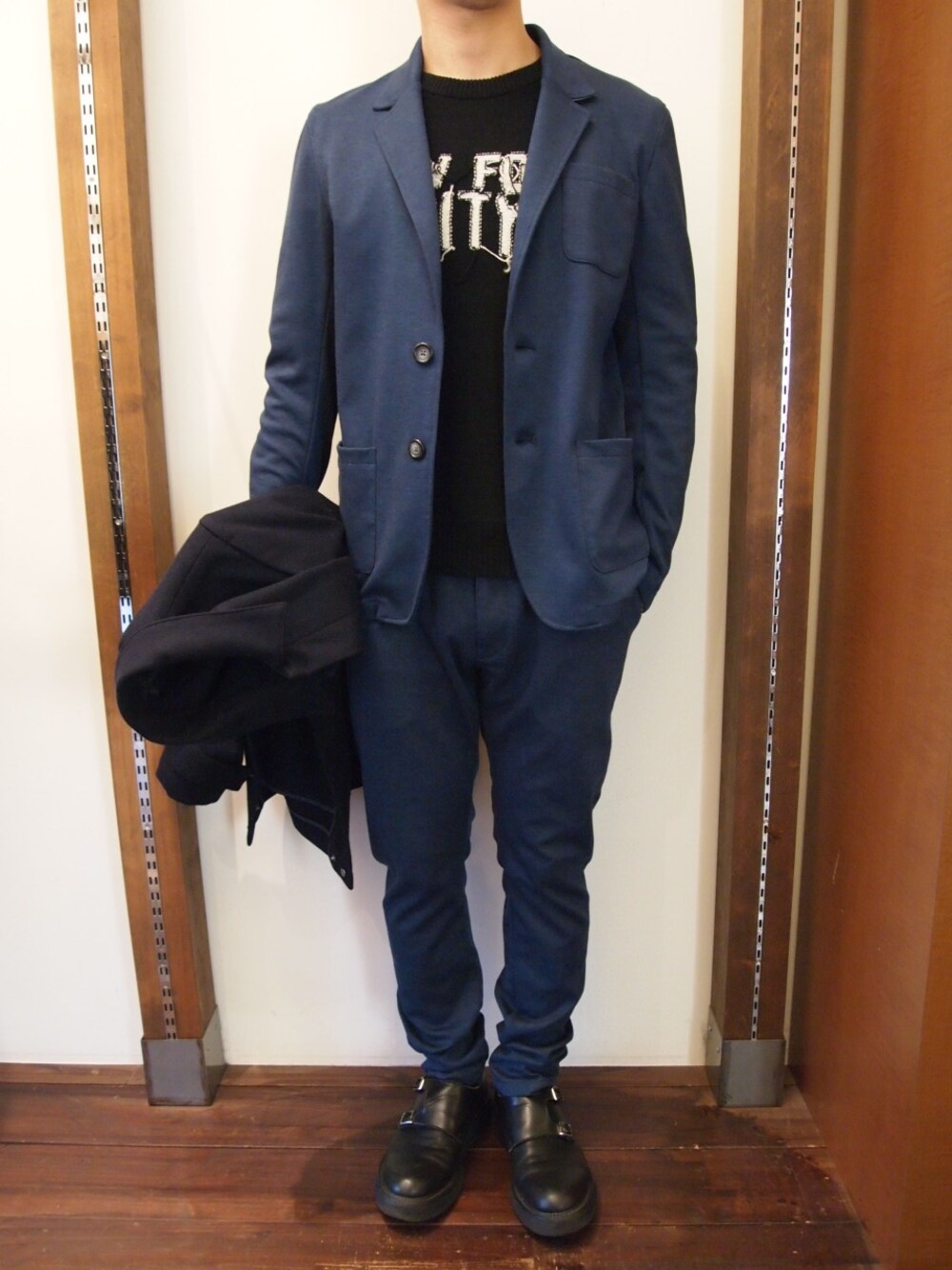 パーティーには、気取らず、かつややカチっと見える、 ストレッチの効いたセットアップを着用。 ウールメルトンのコートは、 2WAYで取り外しも可能なライナーのダウンを抜いて、 ミドル丈のアウターとして着用。 室内に入って、ジャケットを脱いでも、持ち運びしやすく、 BLUE×BLACKでまとめた統一感のあるスタイリングです。