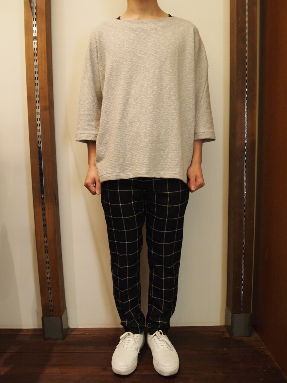 ゆるっとしたニットソー、今から暖かくなったり寒くなったりの時期にかなり使えそうです。 インナーをタンクトップにすれば、抜け感もあり、 長袖シャツを入れれば、レイヤードを楽しめます。 パンツに柄を持ってきて、メリハリのあるコーディネートに仕上げました。
