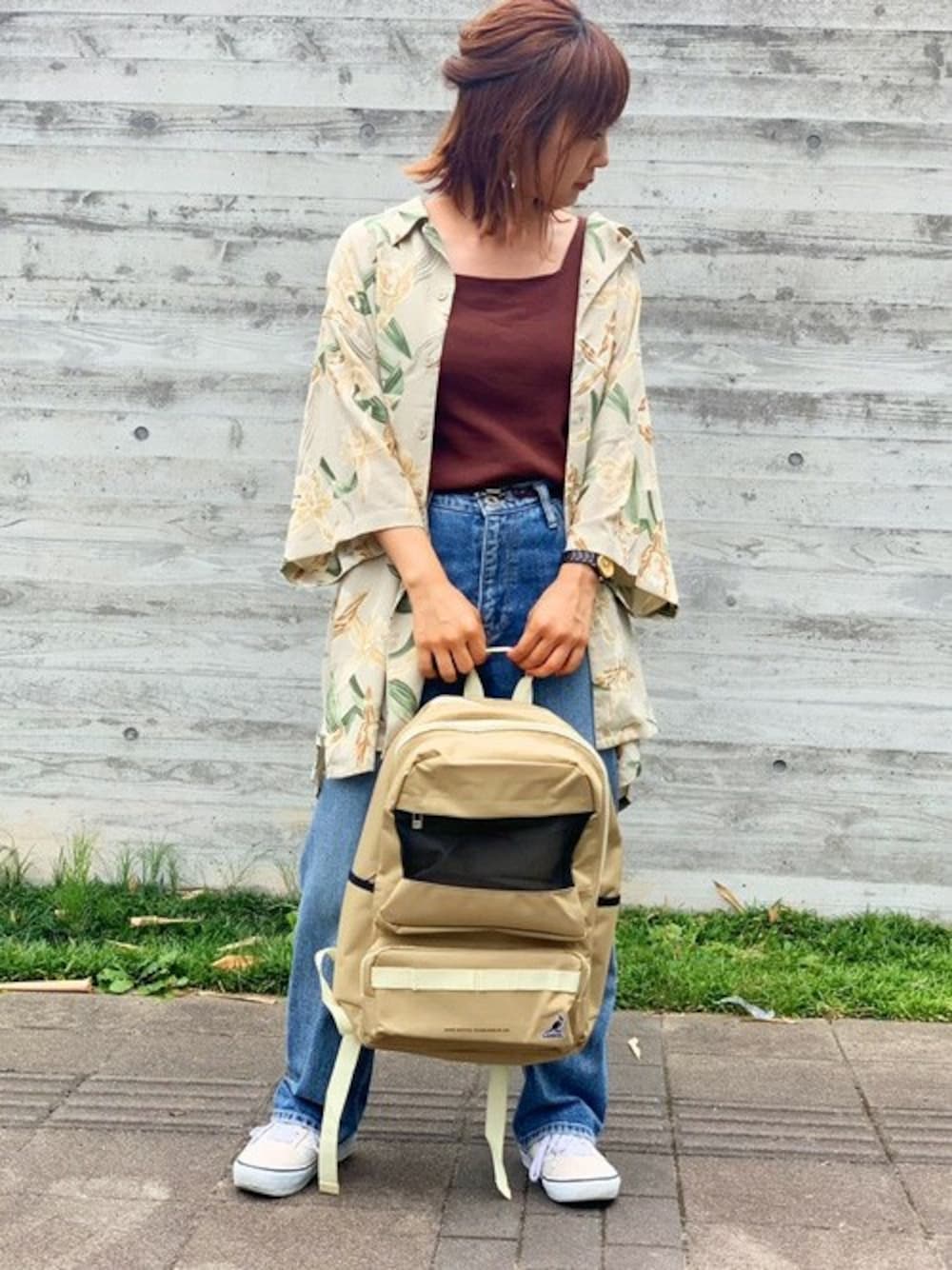 たくさんのポケットが施されたKANGOLのリュックは、ベージュをチョイスして同系色でコーディネートしました! 通勤・通学はもちろん、ジム通いや部活など、普段の荷物プラスαが収納できる大容量ですので、旅行などにも便利なアイテムです♪ 定番のブラックやグレーも良いですが、ベージュカラーのリュックはコーデのアクセントになりますね☆