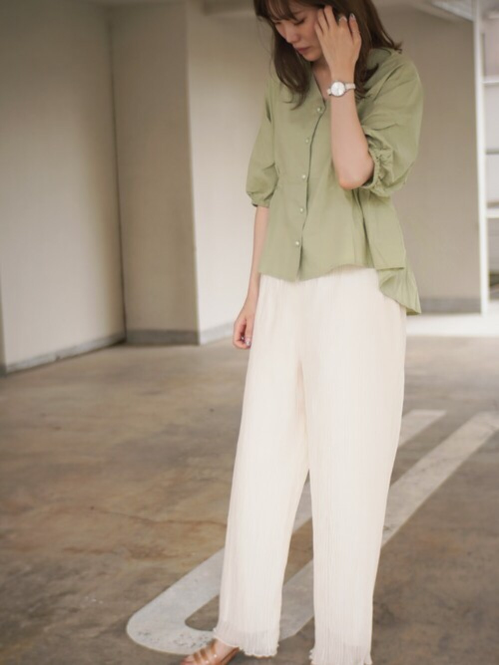 トレンドのピスタチオカラーを取り入れたスタイル! ホワイト系のボトムスを合わせて爽やかに♪