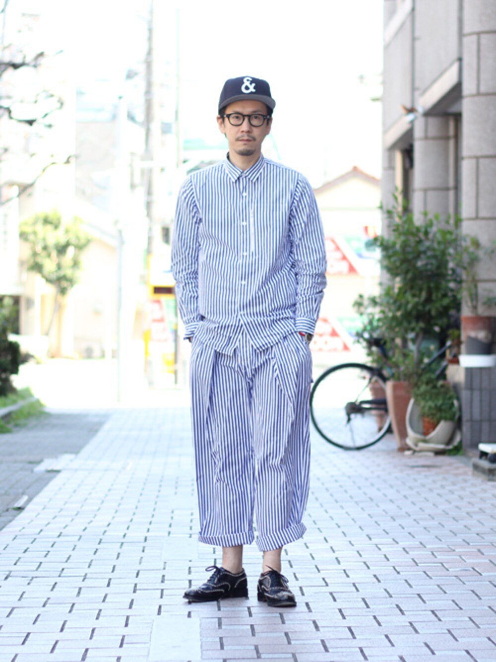 パジャマ感満載なアイテムだけど、キャップとメガネでストリート感を、更に敢えてのドレスシューズでリアルクローズ感を出してみました。