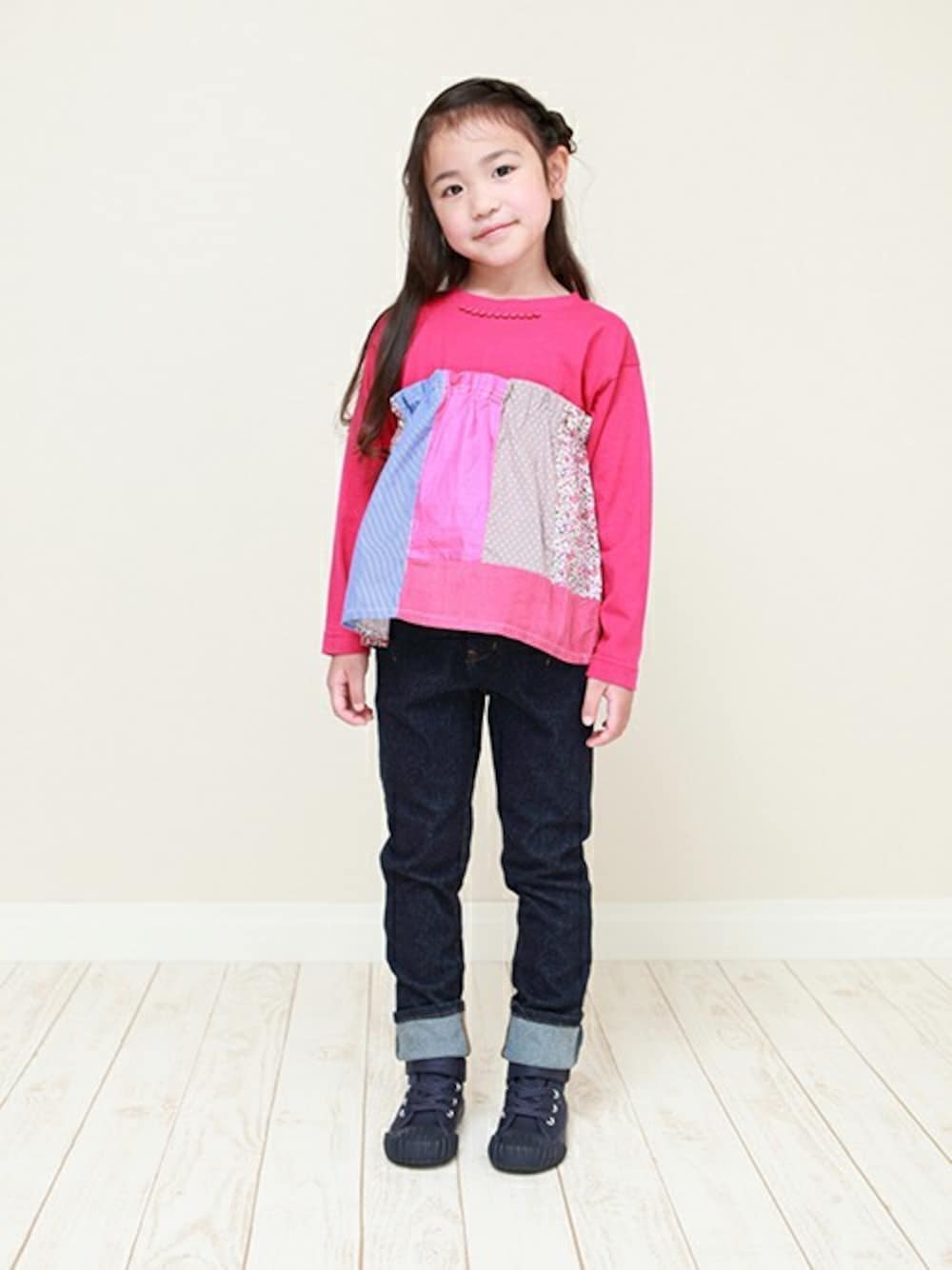 お花やドット、ストライプのパッチワークをギャザーで切り替えたふんわりシルエットの長袖Tシャツ。 お袖やヨーク部分は肌触りがよく動きやすいカットソー素材。 ネックレスのような襟もとのレースやラメのバックプリントもアクセントになっています。 ボトムは着脱しやすいウエスト総ゴム仕様で両サイドにポケット付きなので、通園・通学にも大活躍します。