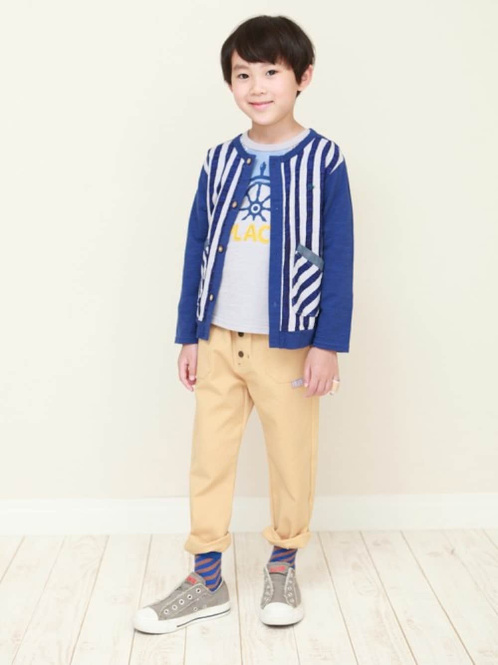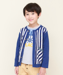 前面をプリントストライプ生地で切り替えたカットソーカーディガンです。 インナーのTシャツは、胸元のパッチワークと船の舵プリントを組み合わせてクールなデザインに仕上げました。 ボトムもすっきりとしたシルエットや、ポケット下のチェック柄タグなど、細かな箇所のディテールにもこだわったパンツです。
