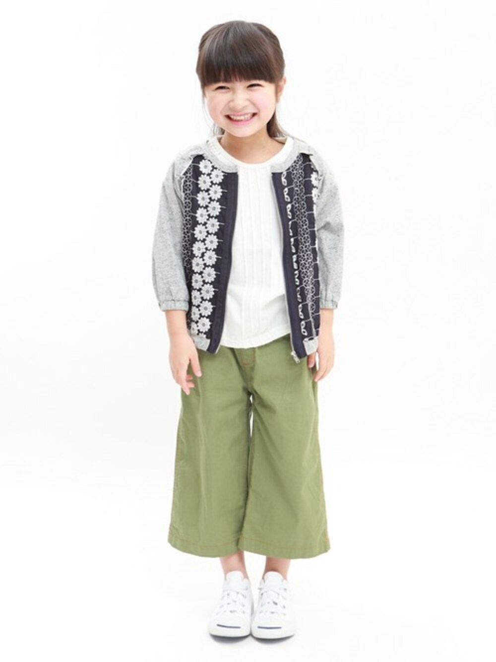 レースづかいが大人テイストなジップアップカーディガンです。 袖口と裾のゴム使いや切替えのフリルがガーリーなデザインになっていますね。 7分袖の羽織は日よけや冷房対策に夏まで活躍するので、オススメの1枚です!