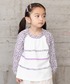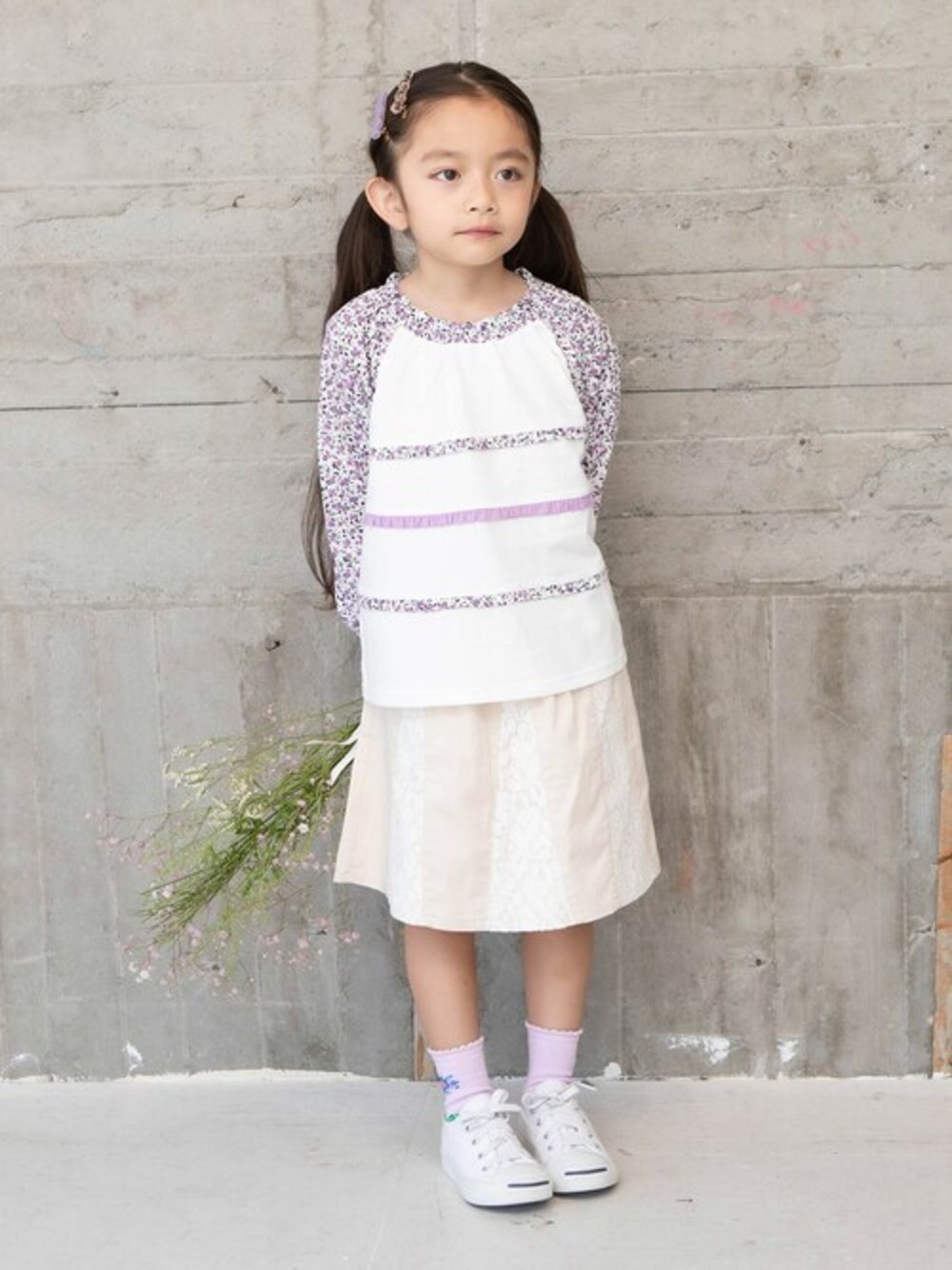 お袖を布帛で切り替えたデザインTシャツ。襟や袖口のゴムづかいやフリルがキュートなデザイン。 スカートやパンツとのコーデバランスのよい少しAラインのシルエットです。