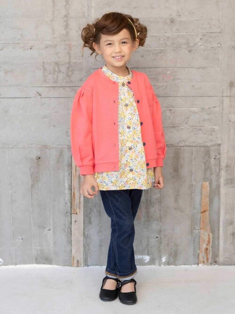 薄手のミニ裏毛を使用したカーディガン。お袖のタックや柄フリルがキュートなデザイン。 シンプルなカーディガンは季節の変わり目にもうれしいアイテム。