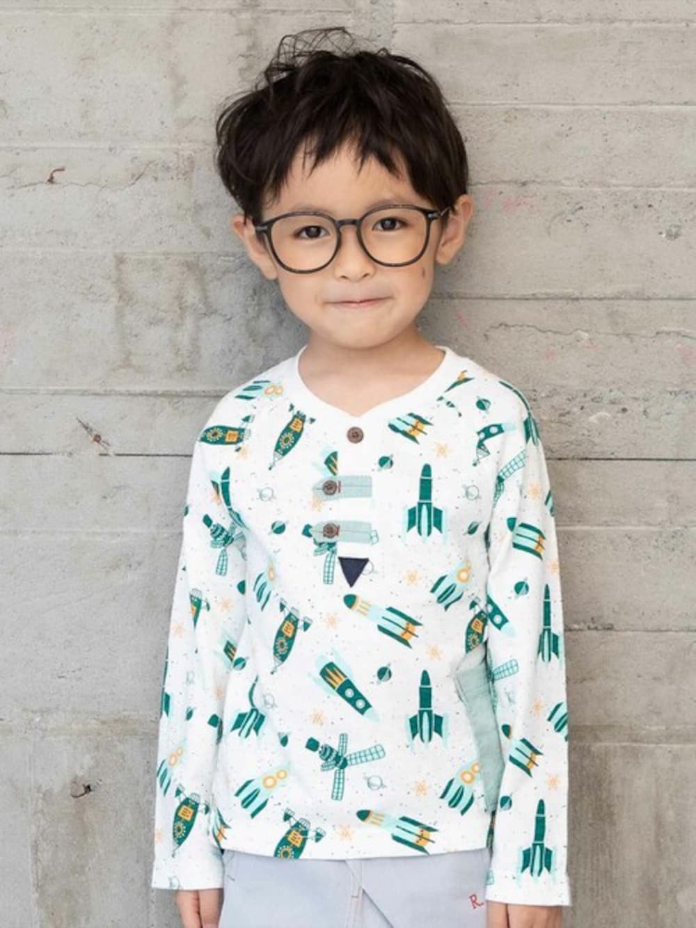男の子が大好きなロケットの総柄プリントがポップなロングスリーブTシャツ。 ヘンリーネックもアクセントになっています。シンプルなボトムを合わせるだけで元気なスタイリングが楽しめます。