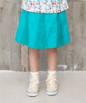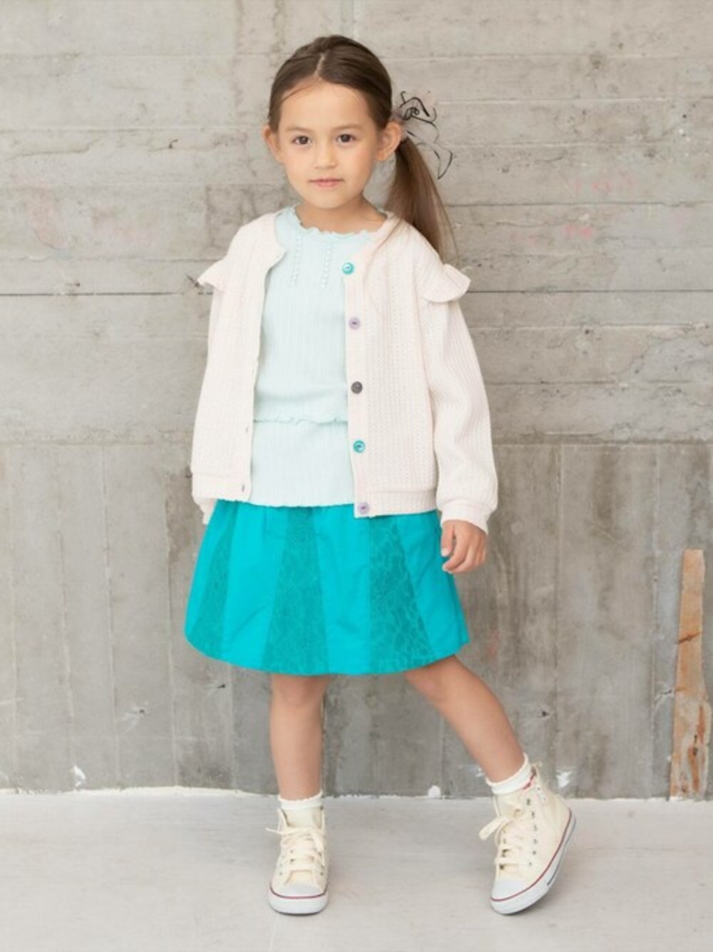 同色のレース切り替えが大人っぽいシンプルなキュロットスカート。 前から見るとスカートのようなデザイン。ストレッチが効いた動きやすい素材で通園通学などデイリーにも大活躍します。