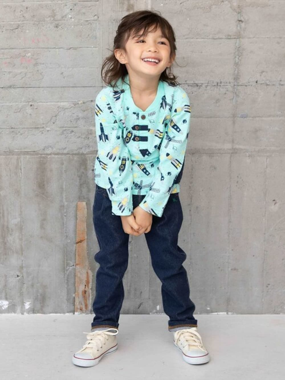 男の子が大好きなロケットの総柄プリントがポップなロングスリーブTシャツ。 ヘンリーネックもアクセントになっています。シンプルなボトムを合わせるだけで元気なスタイリングが楽しめます。