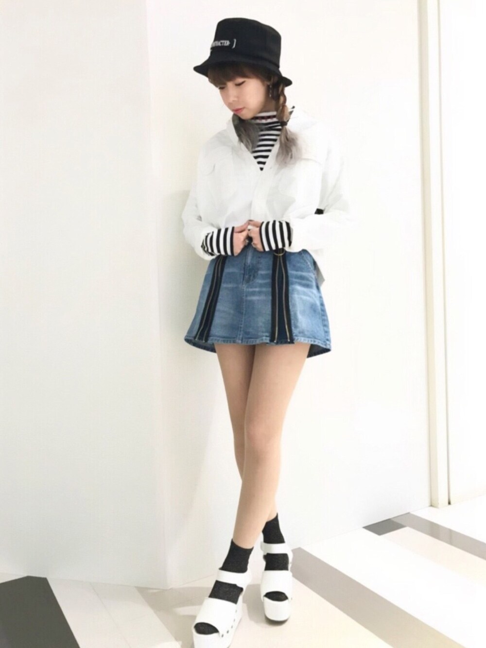 デニムスカートと白シャツの春らしいコーデです♫