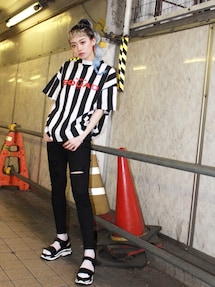 人気のフォトプリントをバックパッチにあしらった薄手のシャツコーデです。