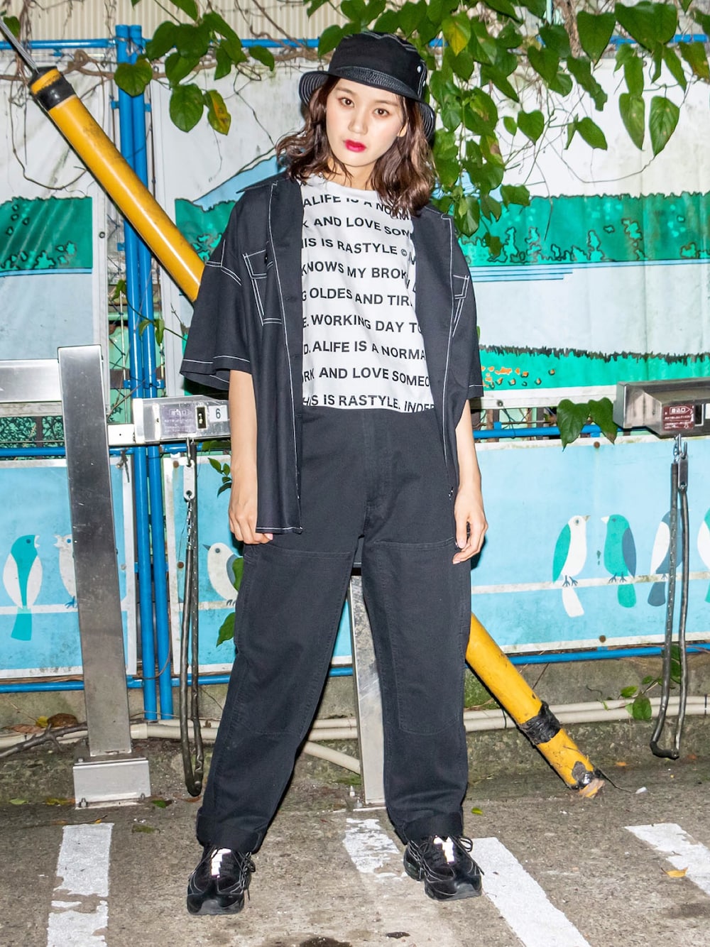 メンズライクなカラーステッチシャツとペインターパンツのコーデです。 モノトーンに映える総ロゴプリントトップスがポイントになりオススメです。