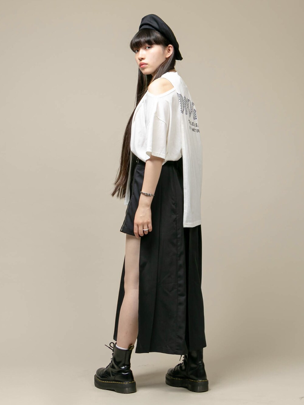レイヤードしたような変形デザインが今季らしいTシャツを使ったコーデ♪ スカートスタイルもモノトーンでクールな印象に♪