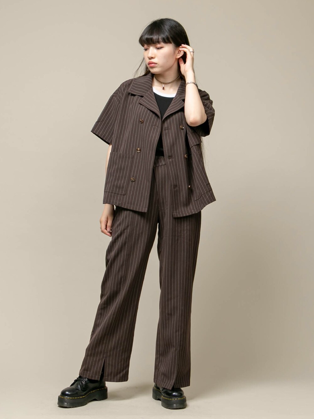 トレンドの解禁シャツもピンストライプや、ダブル仕立てを選ぶとカジュアルすぎない印象になりオススメです。 シャツジャケットと同じ素材を使用した、タックパンツを合わせてセットアップスタイルもオススメです♪