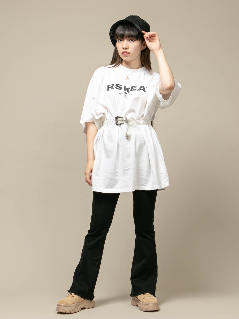 人気のオーバーサイズTシャツもウエストマークをすれば、ボトムとも好相性なコーデに♪ コンチョベルトを選べばいっきに旬のスタイリングになりオススメです。