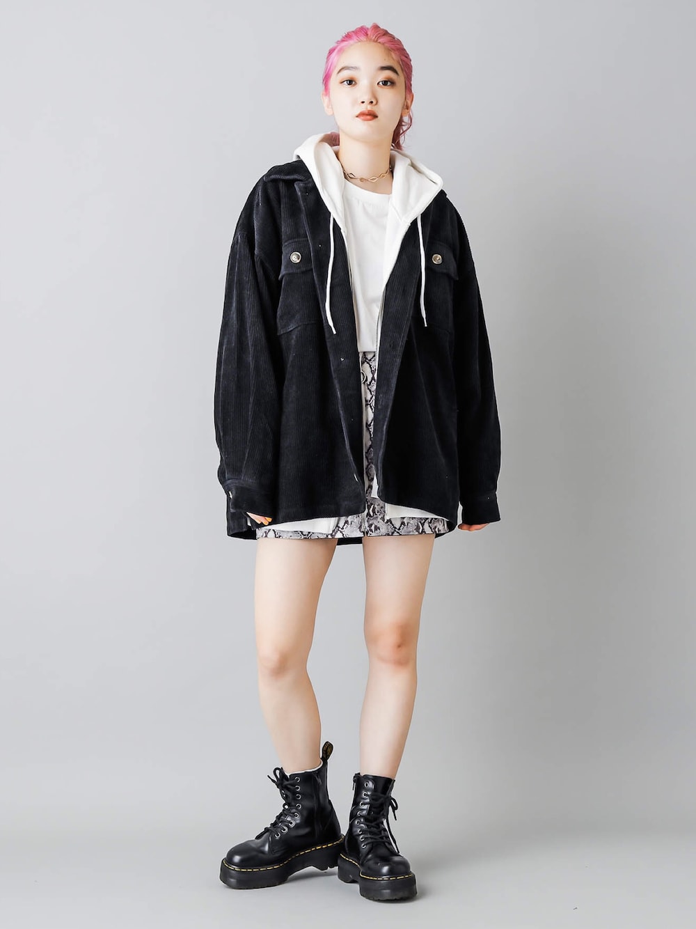 オーバーサイズのコーデュロイシャツの中にメンズライクなパーカーを仕込めば、旬なスタイルの完成♪ トレンドのパイソン柄も、ミニスカートなら主張しすぎず、コーデに取り入れやすくてオススメです。