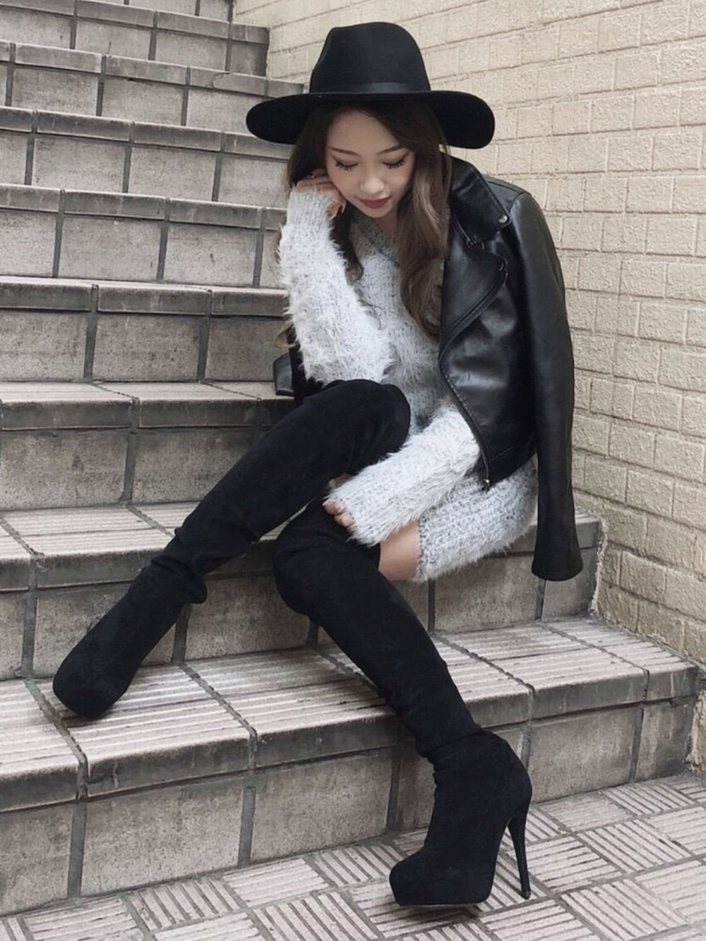 RESEXXY定番のニットシャギーニット。 甘くなり過ぎないように、 レザー&ブラックの小物でまとめました❤︎