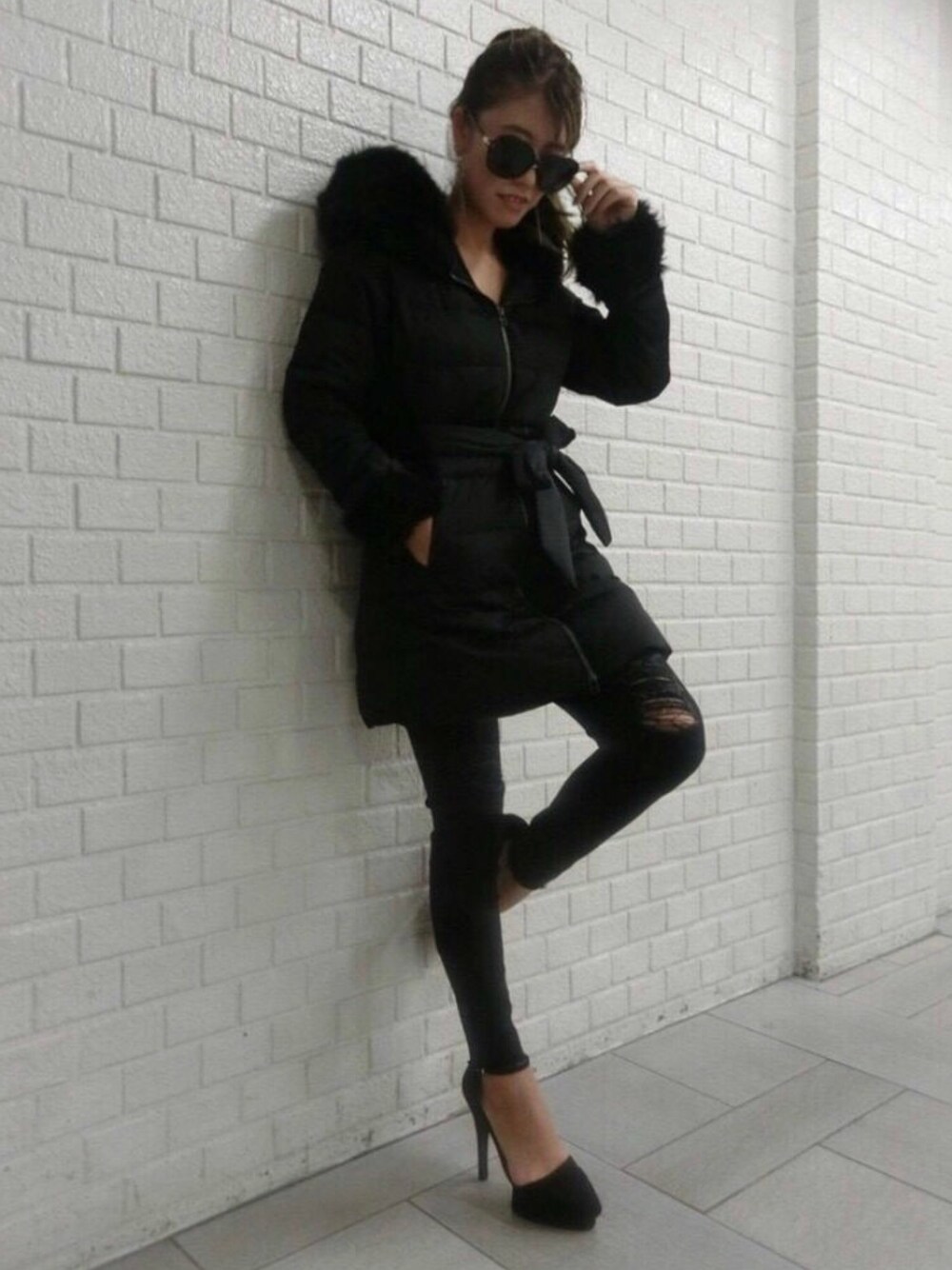 オールブラックコーデは、 アップヘアーですっきりと❤︎ 足元や胸元で透け感を 演出するのがポイントです!