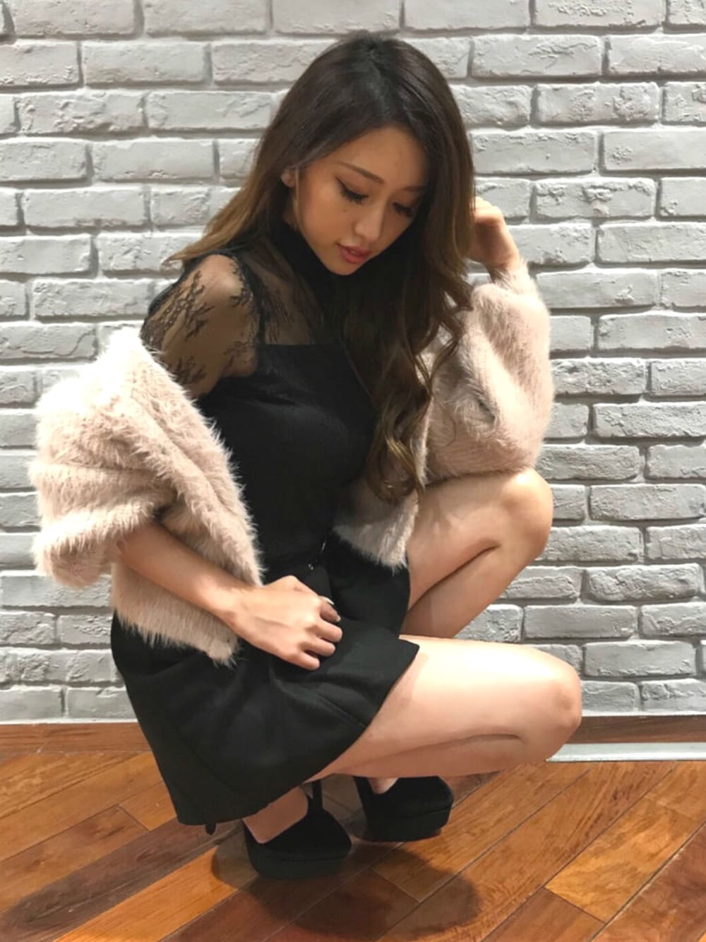 レース×ピンクのシャギーカーデで デートにもぴったりのモテコーデに♡ カーディガン以外をブラックでまとめると少しオトナな印象に。