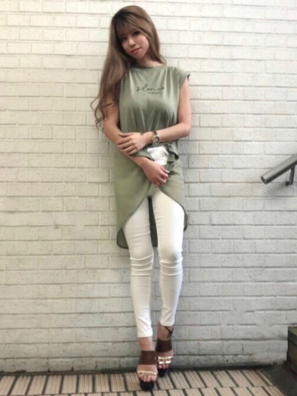 カーキ×ホワイトは夏に絶対挑戦したいコーデ♡ バックロングのデザインは、体系カバーができるのもうれしいポイント♡ STAFF:kazue