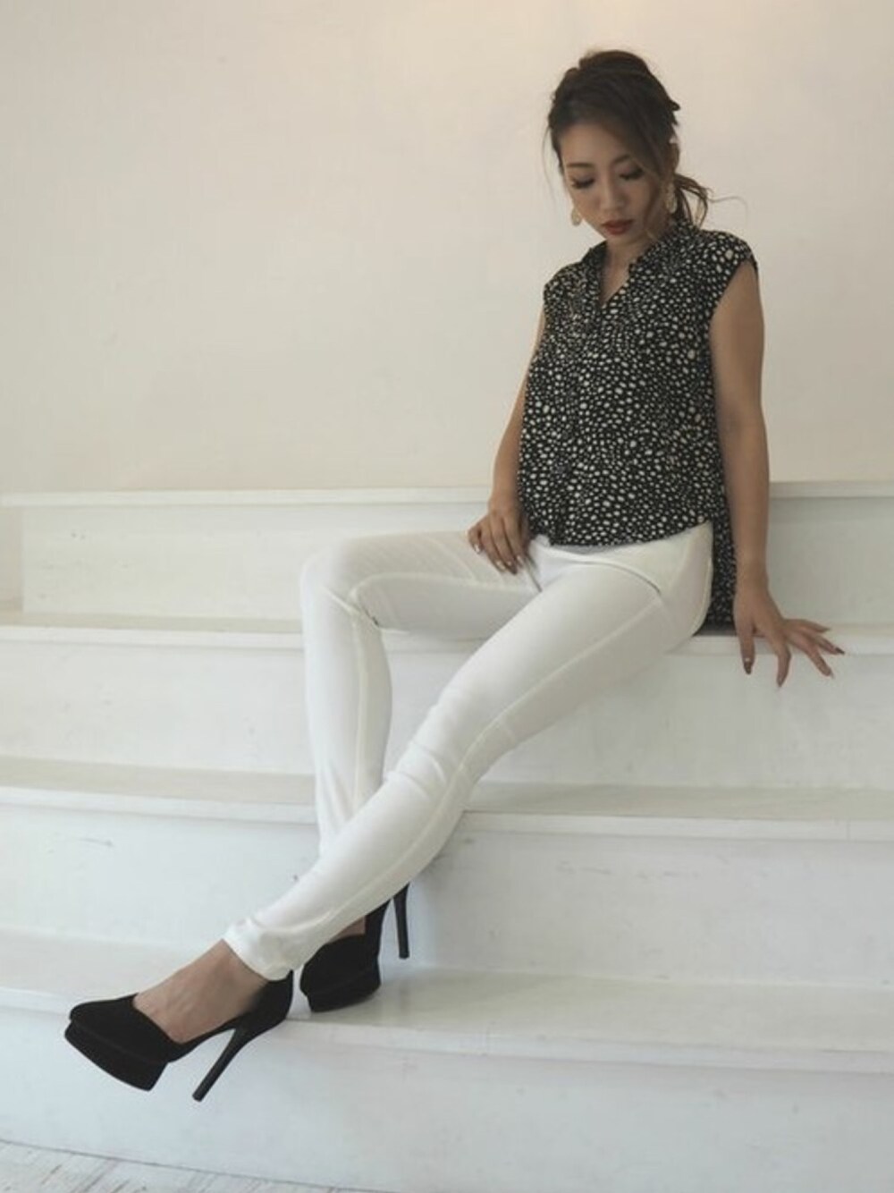 柄アイテムはモノトーンでまとめて奇抜になりすぎないように。 襟のあるトップスにはアップヘアーがおススメ♡ STAFF:rino Instagram :@rino__arai