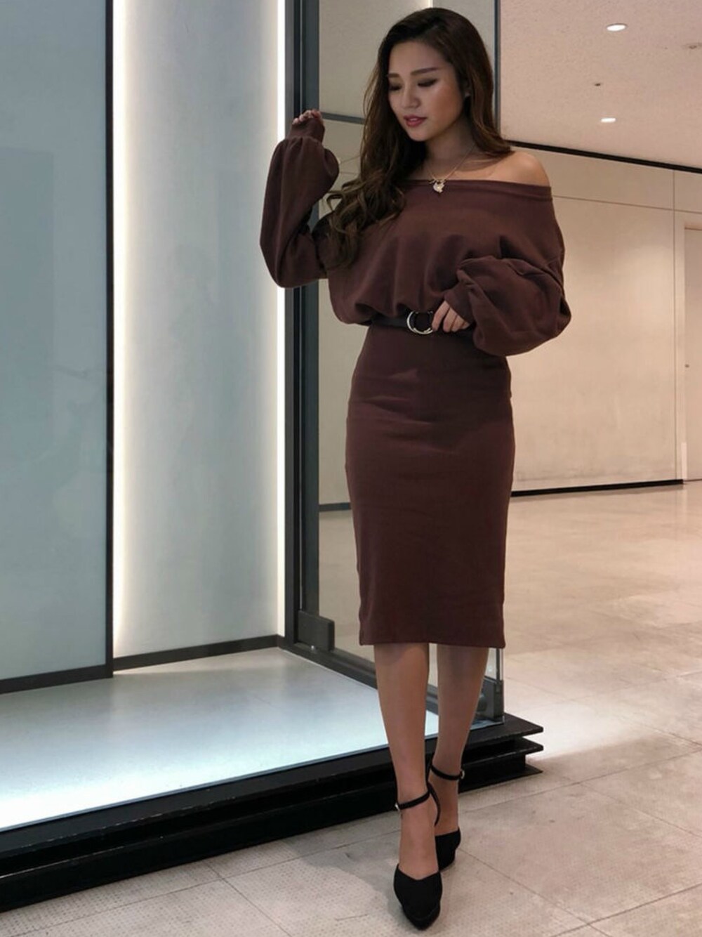 タイトワンピを、裏毛素材で少しカジュアルダウン! デコルテ見せと足元のヒールで女っぽさは忘れずに♡ STAFF:kayo