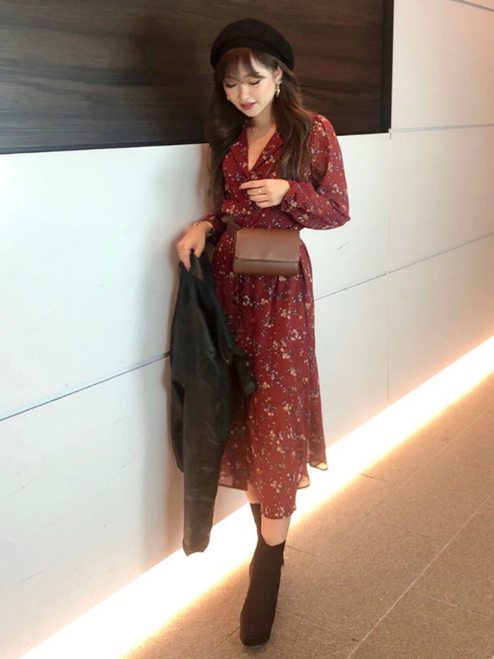 クラシックな花柄ワンピースは1枚で秋コーデに。 ウエストのBAGはワンピースに馴染むようにブラウンをチョイス! STAFF:erika Instagram :@erika_kida