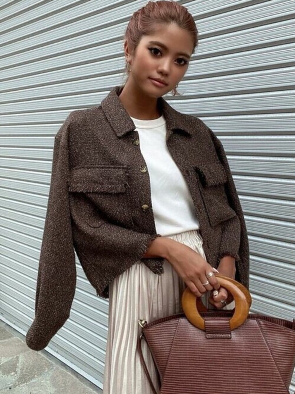 トレンドのツイードを使用したジャケット☺︎ 落ち着いたブラウンで大人っぽく着用できます♪ STAFF:mana instagram:@mana_resexxy